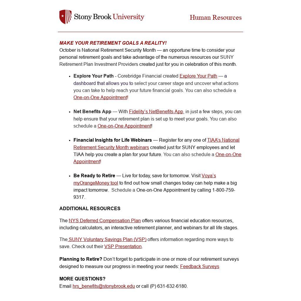 October is National Retirement Security Month — an opportune time to consider your personal retirement goals and take advantage of the numerous resources our SUNY Retirement Plan Investment Providers created just for you in celebration of this month.