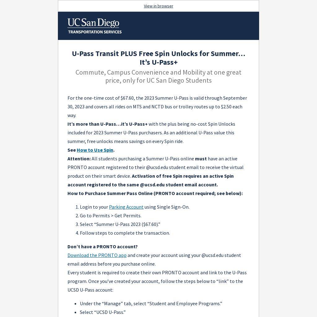 Attention: All students purchasing a Summer U-Pass online must have an active PRONTO account registered to their @ucsd.edu student email to receive the virtual product on their smart device. Activation of free Spin requires an active Spin account registered to the same @ucsd.edu student email account.