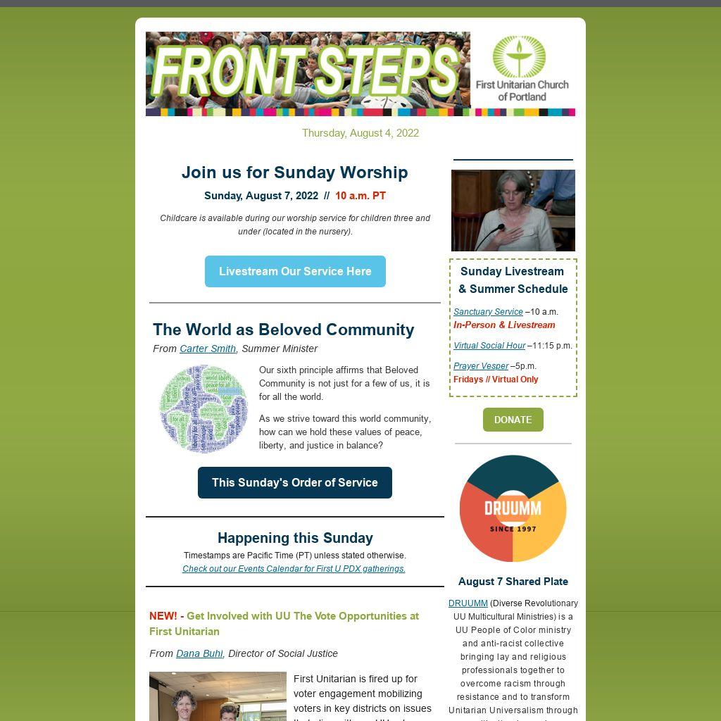 Timestamps are Pacific Time (PT) unless stated otherwise. Check out our Events Calendar for First U PDX gatherings.