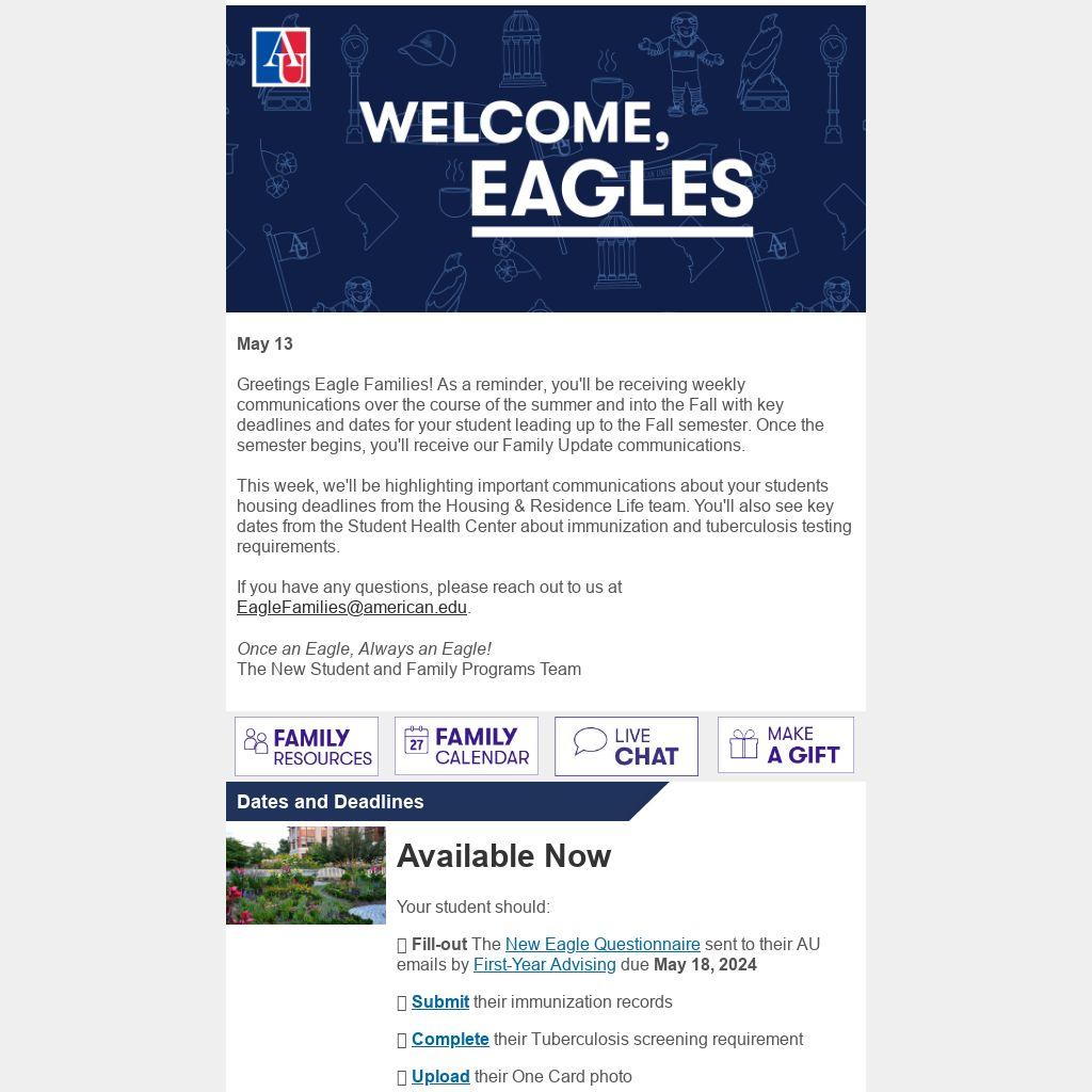 Greetings Eagle Families! As a reminder, you'll be receiving weekly communications over the course of the summer and into the Fall with key deadlines and dates for your student leading up to the Fall semester. Once the semester begins, you'll receive our Family Update communications.