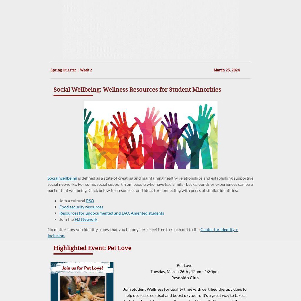 Open studio allows individuals to express their feelings and thoughts through a creative and therapeutic process because sometimes words are not enough. Join every Thursday, from 2:00 – 4:30 PM at the Student Wellness Center Room 1058 B.