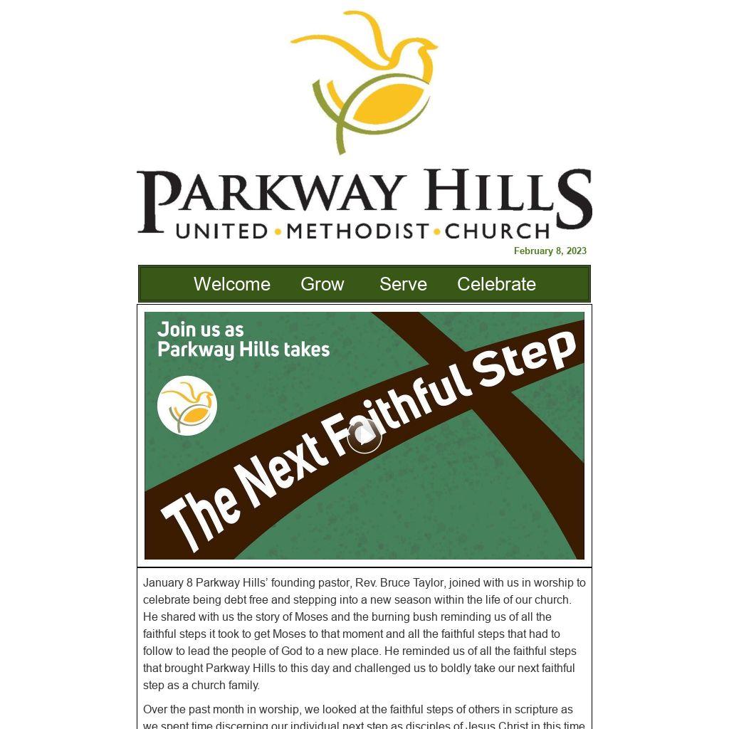 January 8 Parkway Hills’ founding pastor, Rev. Bruce Taylor, joined with us in worship to celebrate being debt free and stepping into a new season within the life of our church. He shared with us the story of Moses and the burning bush reminding us of all the faithful steps it took to get Moses to that moment and all the faithful steps that had to follow to lead the people of God to a new place. He reminded us of all the faithful steps that brought Parkway Hills to this day and challenged us to boldly take our next faithful step as a church family.