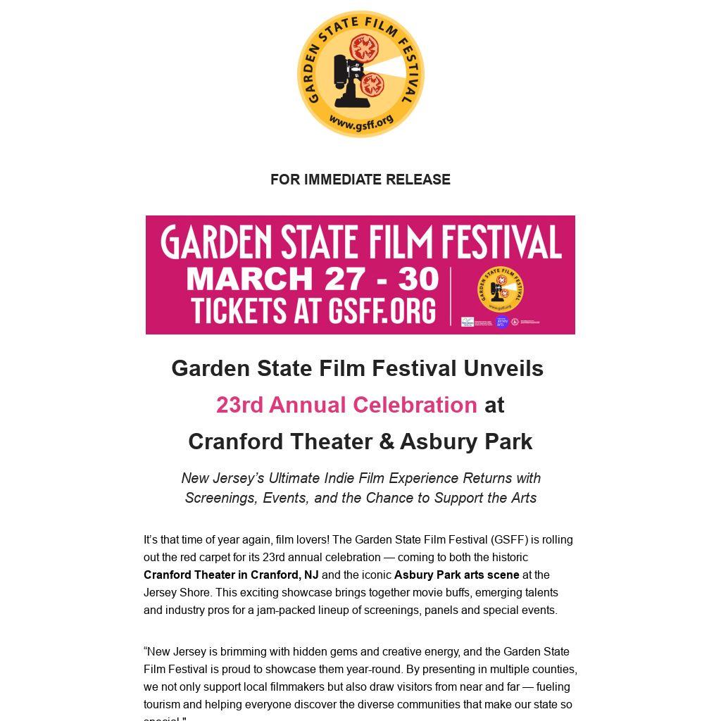 “We’re thrilled to bring the Garden State Film Festival back to Cranford and Asbury Park for our 23rd year. These screenings represent our commitment to showcasing independent films that inspire, challenge and entertain. We invite everyone to join us in celebrating the arts and supporting emerging voices — while having an unforgettable time at the movies," - Lauren Concar Sheehy