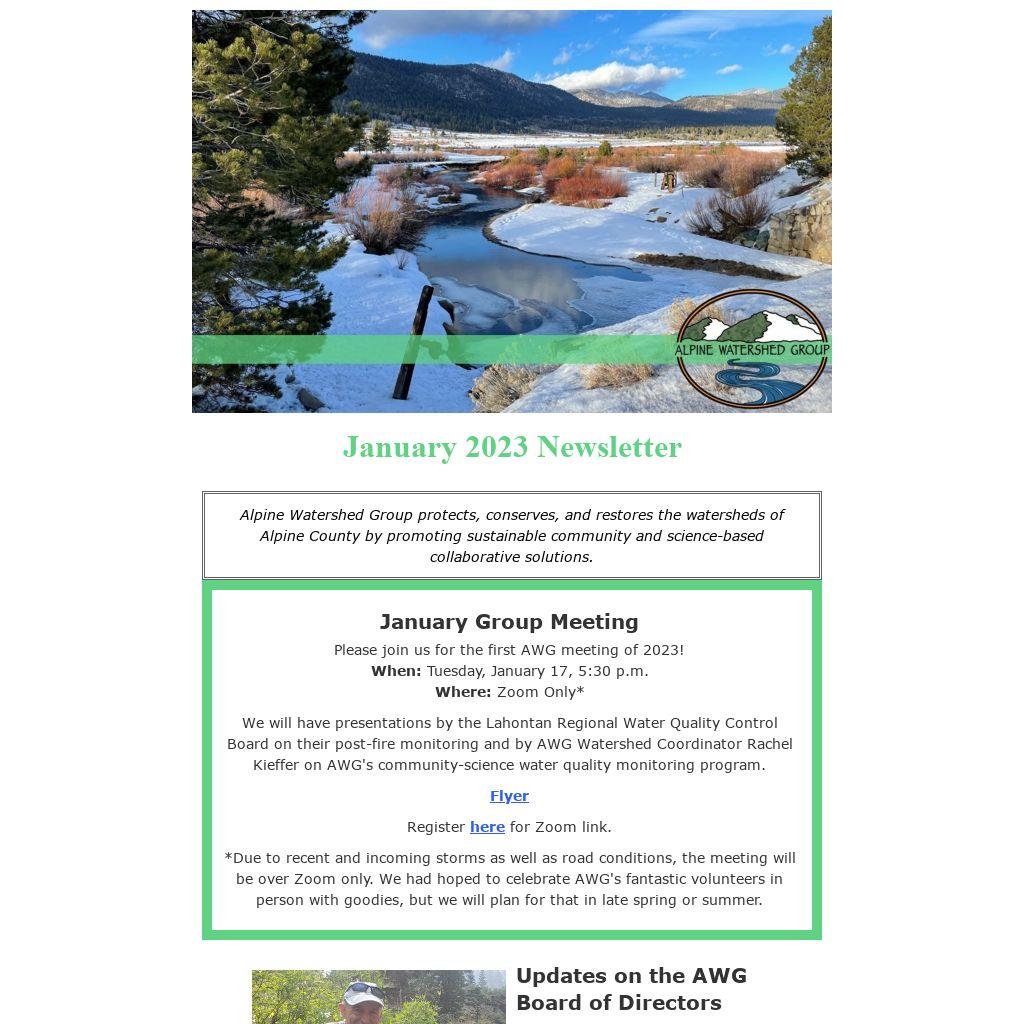 *Due to recent and incoming storms as well as road conditions, the meeting will be over Zoom only. We had hoped to celebrate AWG's fantastic volunteers in person with goodies, but we will plan for that in late spring or summer.