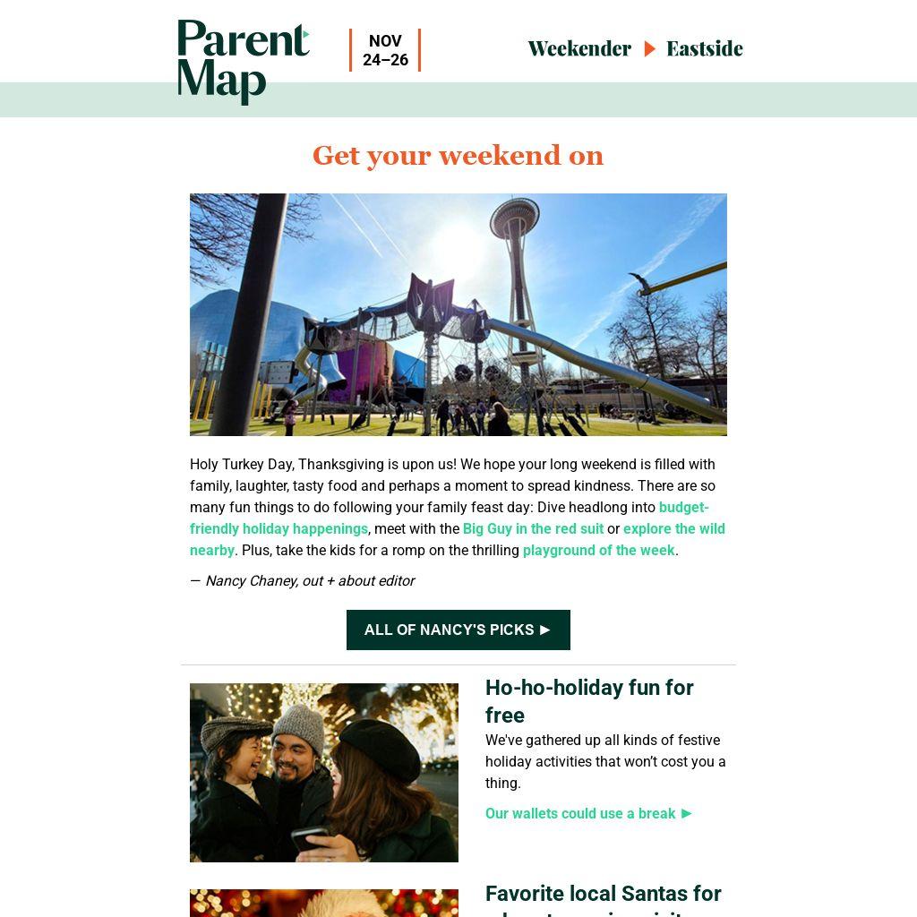 Holy Turkey Day, Thanksgiving is upon us! We hope your long weekend is filled with family, laughter, tasty food and perhaps a moment to spread kindness. There are so many fun things to do following your family feast day: Dive headlong into budget-friendly holiday happenings, meet with the Big Guy in the red suit or explore the wild nearby. Plus, take the kids for a romp on the thrilling playground of the week.