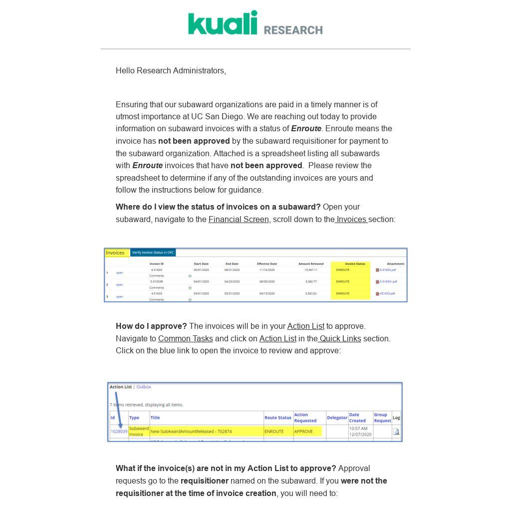Ensuring that our subaward organizations are paid in a timely manner is of utmost importance at UC San Diego. We are reaching out today to provide information on subaward invoices with a status of Enroute. Enroute means the invoice has not been approved by the subaward requisitioner for payment to the subaward organization. Attached is a spreadsheet listing all subawards with Enroute invoices that have not been approved. Please review the spreadsheet to determine if any of the outstanding invoices are yours and follow the instructions below for guidance.