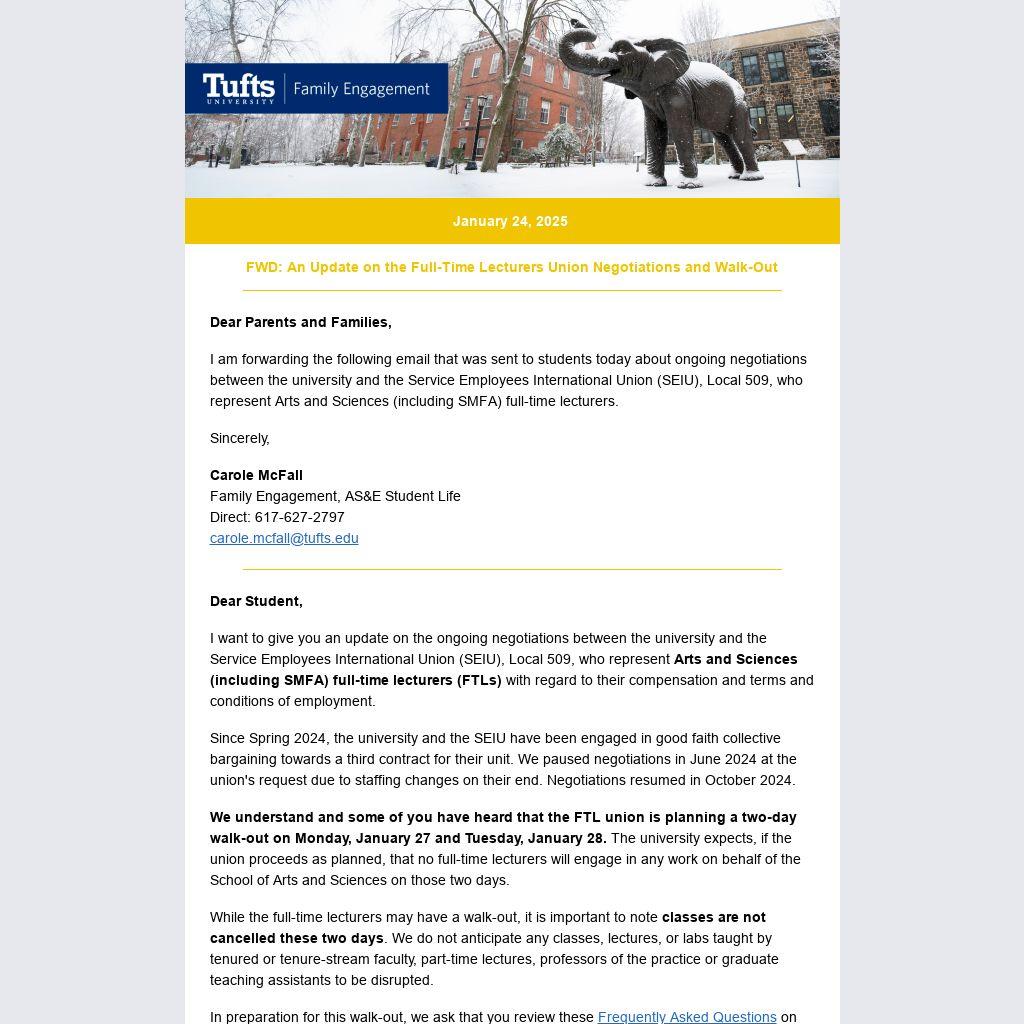 We understand and some of you have heard that the FTL union is planning a two-day walk-out on Monday, January 27 and Tuesday, January 28. The university expects, if the union proceeds as planned, that no full-time lecturers will engage in any work on behalf of the School of Arts and Sciences on those two days.