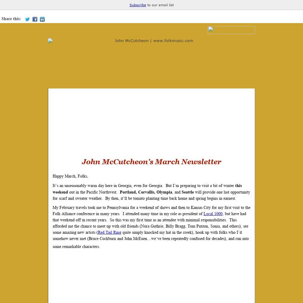 | John McCutcheon's March Newsletter