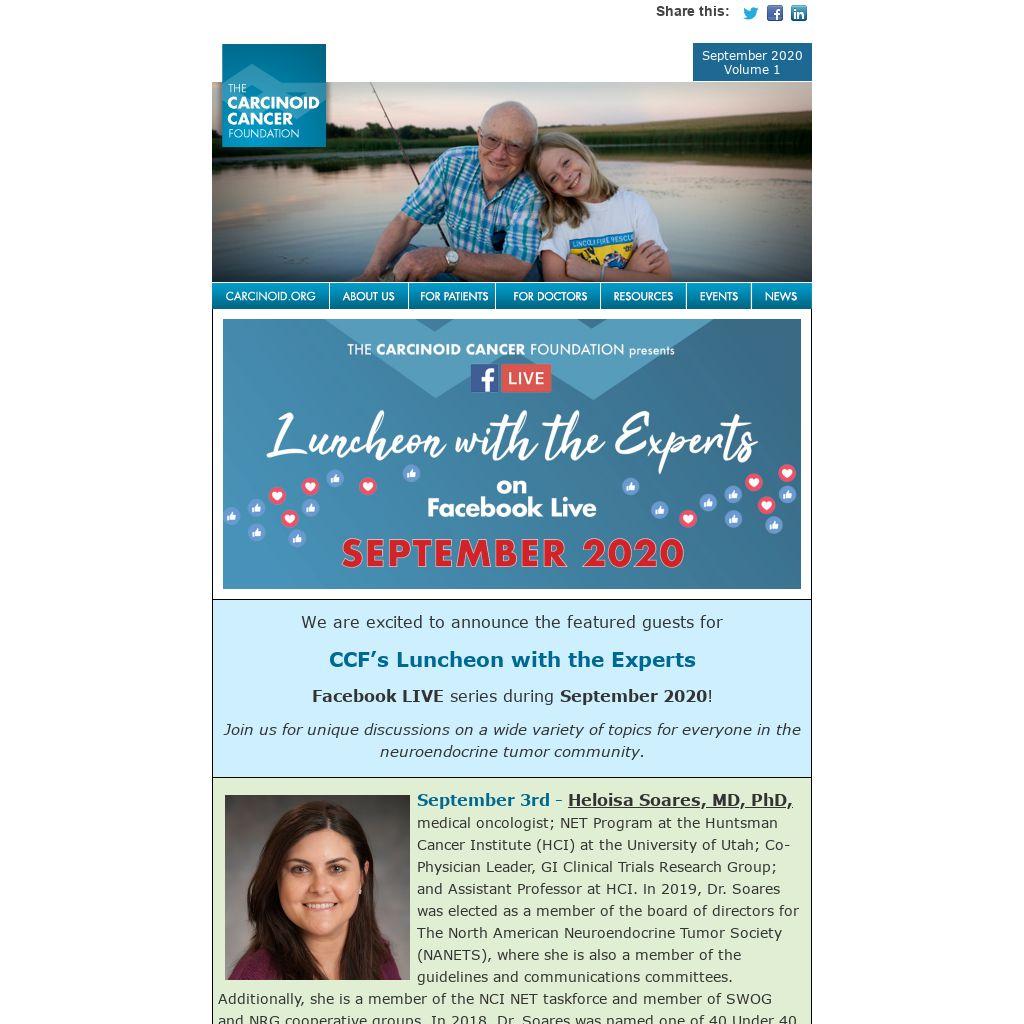 This Facebook LIVE event will be hosted by Rain Bennett, a longtime CCF filmmaker and dear friend of the NET community. To view the program come to CCF's Facebook page, https://www.facebook.com/Carcinoid/, at noon Eastern Time. There is no need to register and there is no special link.