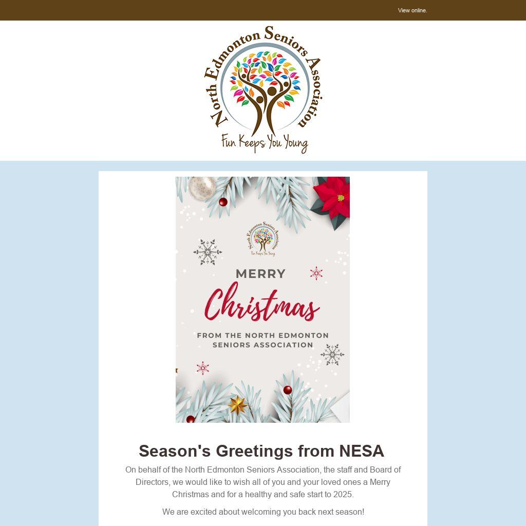 On behalf of the North Edmonton Seniors Association, the staff and Board of Directors, we would like to wish all of you and your loved ones a Merry Christmas and for a healthy and safe start to 2025.