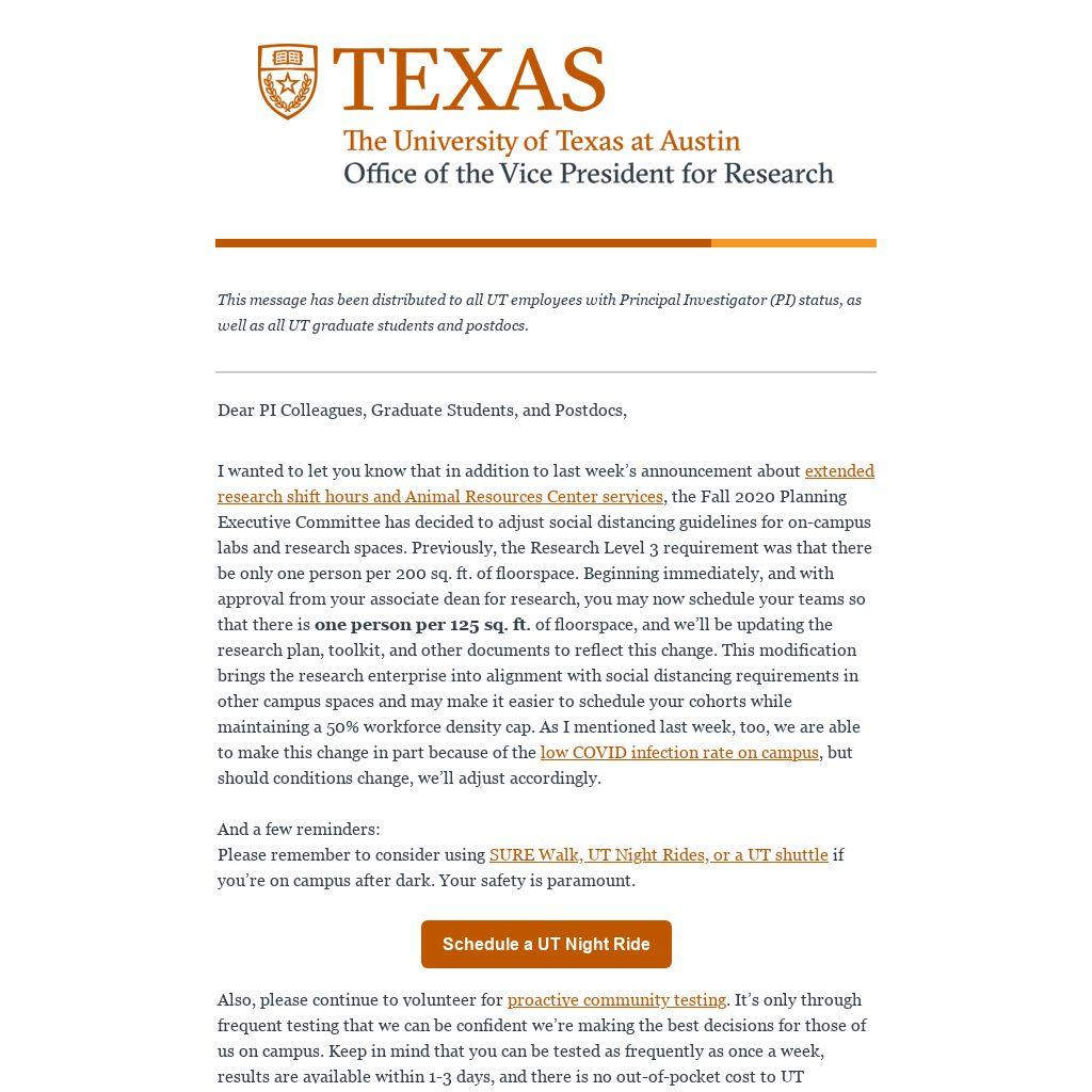 I know I’ve said this before, but it bears repeating: these are stressful and difficult times, and I thank each of you for your continued patience and flexibility. I hope that adjusting shift hours and the square footage requirement renormalizes operations a bit and makes it easier for you to conduct on-campus research.