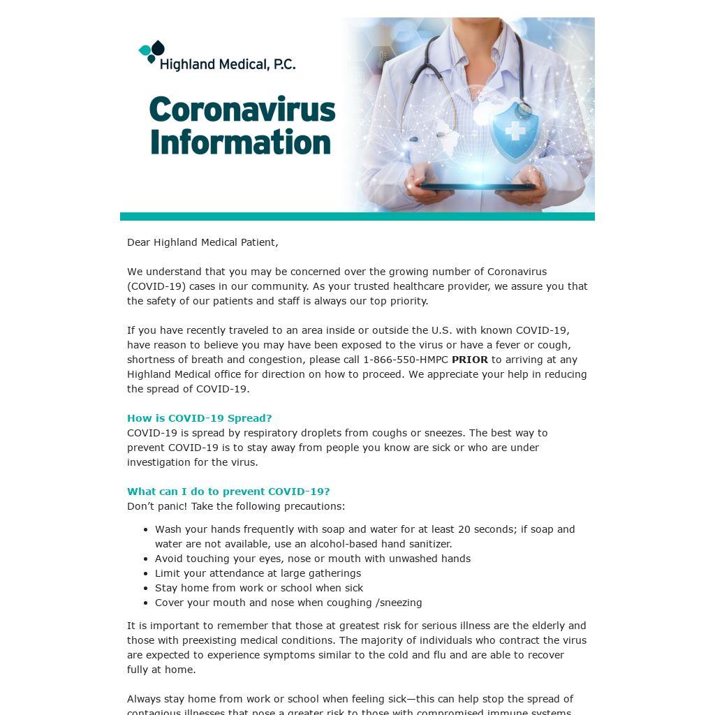 If you have recently traveled to an area inside or outside the U.S. with known COVID-19, have reason to believe you may have been exposed to the virus or have a fever or cough, shortness of breath and congestion, please call 1-866-550-HMPC PRIOR to arriving at any Highland Medical office for direction on how to proceed. We appreciate your help in reducing the spread of COVID-19.