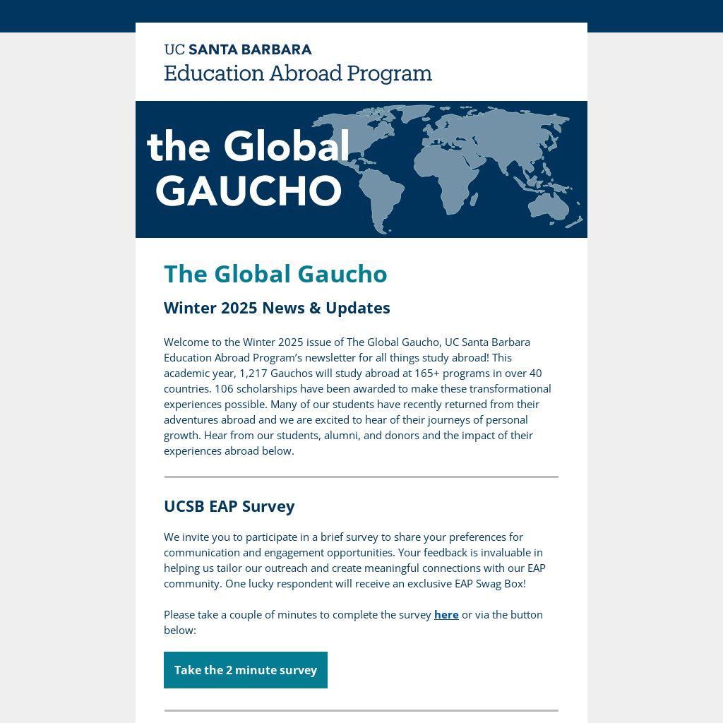 Welcome to the Winter 2025 issue of The Global Gaucho, UC Santa Barbara Education Abroad Program’s newsletter for all things study abroad! This academic year, 1,217 Gauchos will study abroad at 165+ programs in over 40 countries. 106 scholarships have been awarded to make these transformational experiences possible. Many of our students have recently returned from their adventures abroad and we are excited to hear of their journeys of personal growth. Hear from our students, alumni, and donors and the impact of their experiences abroad below.