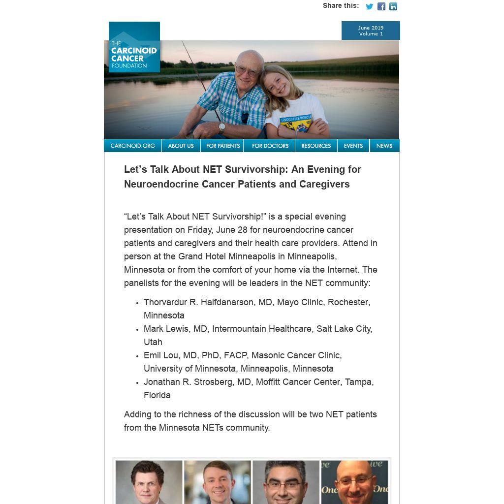 “Let’s Talk About NET Survivorship!” is a special evening presentation on Friday, June 28 for neuroendocrine cancer patients and caregivers and their health care providers. Attend in person at the Grand Hotel Minneapolis in Minneapolis, Minnesota or from the comfort of your home via the Internet. The panelists for the evening will be leaders in the NET community: