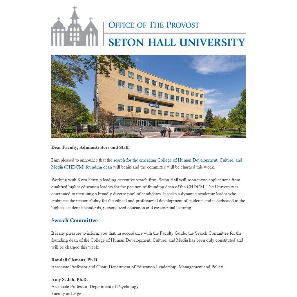 It is my pleasure to inform you that, in accordance with the Faculty Guide, the Search Committee for the founding dean of the College of Human Development, Culture, and Media has been duly constituted and will be charged this week: