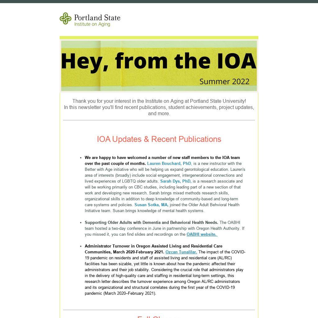 Thank you for your interest in the Institute on Aging at Portland State University! In this newsletter you'll find recent publications, student achievements, project updates, and more.