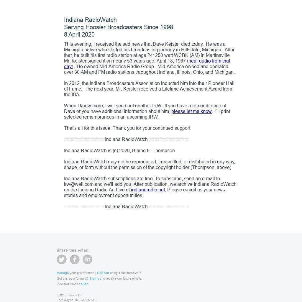 This evening, I received the sad news that Dave Keister died today. He was a Michigan native who started his broadcasting journey in Hillsdale, Michigan. After that, he built his first radio station at age 24: 250 watt WCBK (AM) in Martinsville. Mr. Keister signed it on nearly 53 years ago: April 18, 1967 (hear audio from that day). He owned Mid-America Radio Group. Mid-America owned and operated over 30 AM and FM radio stations throughout Indiana, Illinois, Ohio, and Michigan.