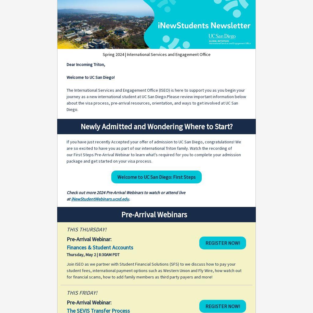 The International Services and Engagement Office (ISEO) is here to support you as you begin your journey as a new international student at UC San Diego.Please review important information below about the visa process, pre-arrival resources, orientation, and ways to get involved at UC San Diego.