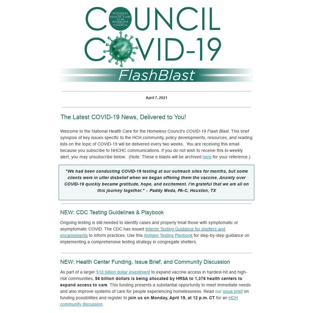 Welcome to the National Health Care for the Homeless Council’s COVID-19 Flash Blast. This brief synopsis of key issues specific to the HCH community, policy developments, resources, and reading lists on the topic of COVID-19 will be delivered every two weeks. You are receiving this email because you subscribe to NHCHC communications. If you do not wish to receive this bi-weekly alert, you may unsubscribe below. (Note: These e-blasts will be archived here for your reference.)