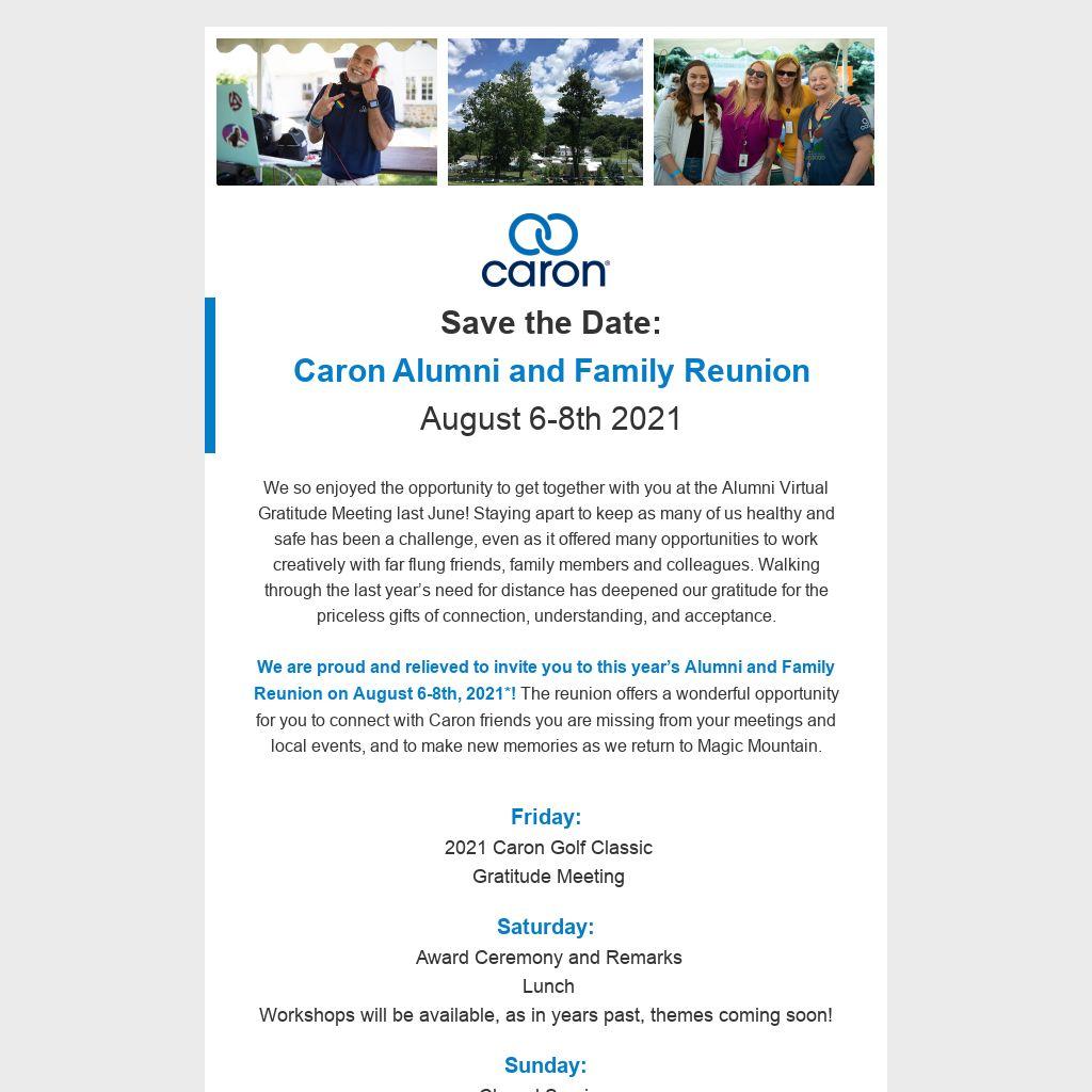 We are proud and relieved to invite you to this year’s Alumni and Family Reunion on August 6-8th, 2021*! The reunion offers a wonderful opportunity for you to connect with Caron friends you are missing from your meetings and local events, and to make new memories as we return to Magic Mountain.