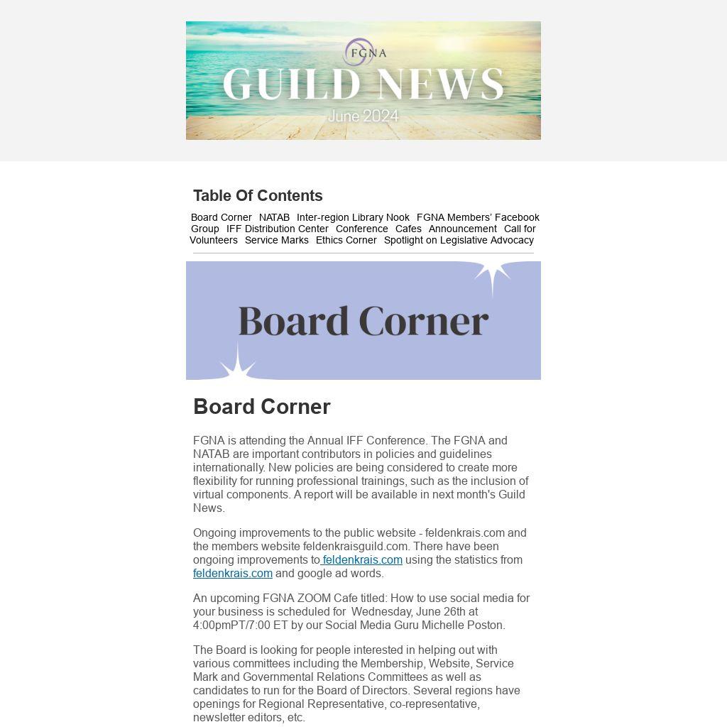 Show your commitment to the values of FGNA and help to shape its future. Become part of our leadership team that steers our presence with membership and the public, our affiliation with other Guilds, and our legislative voice in government relations. FGNA Members who are Guild Certified Feldenkrais PractitionersCM or Certified Feldenkrais Awareness Through Movement TeachersCM are eligible to serve as Directors.Ā