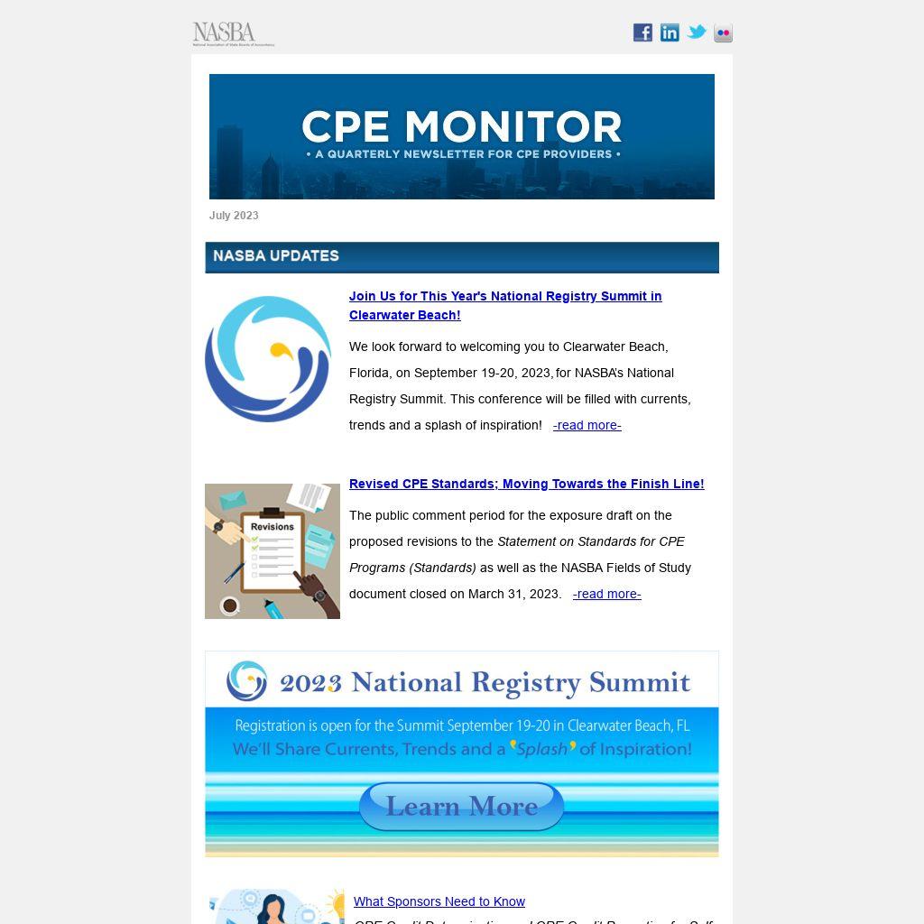 Click here to see the organizations that have been added to the National Registry of CPE Sponsors from April 1, 2023 through June 30, 2023.