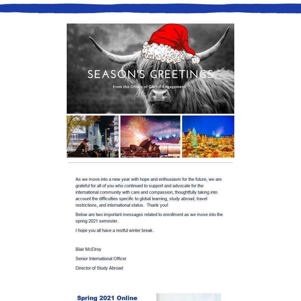As we move into a new year with hope and enthusiasm for the future, we are grateful for all of you who continued to support and advocate for the international community with care and compassion, thoughtfully taking into account the difficulties specific to global learning, study abroad, travel restrictions, and international status. Thank you!