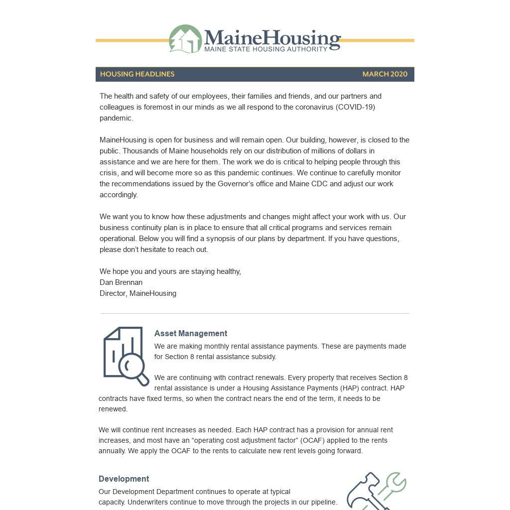 If you have a voucher through MaineHousing and have lost your job or have had a decrease in your income, please contact us at 207-624-5789 so we can discuss modifying your contribution to your rent.