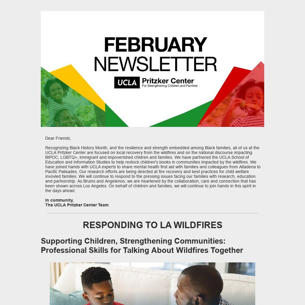 Recognizing Black History Month, and the resilience and strength embedded among Black families, all of us at the UCLA Pritzker Center are focused on local recovery from the wildfires and on the national discourse impacting BIPOC, LGBTQ+, immigrant and impoverished chldren and families. We have partnered the UCLA School of Education and Information Studies to help restock children's books in communities impacted by the wildfires. We have joined hands with UCLA experts to share mental health first aid with families and colleagues from Altadena to Pacific Palisades. Our research efforts are being directed at fire recovery and best practices for child welfare invovled families. We will continue to respond to the pressing issues facing our families with research, education and partnership. As Bruins and Angelenos, we are heartened by the collaboration, care and connection that has been shown across Los Angeles. On behalf of children and families, we will continue to join hands in this spirit in the days ahead.