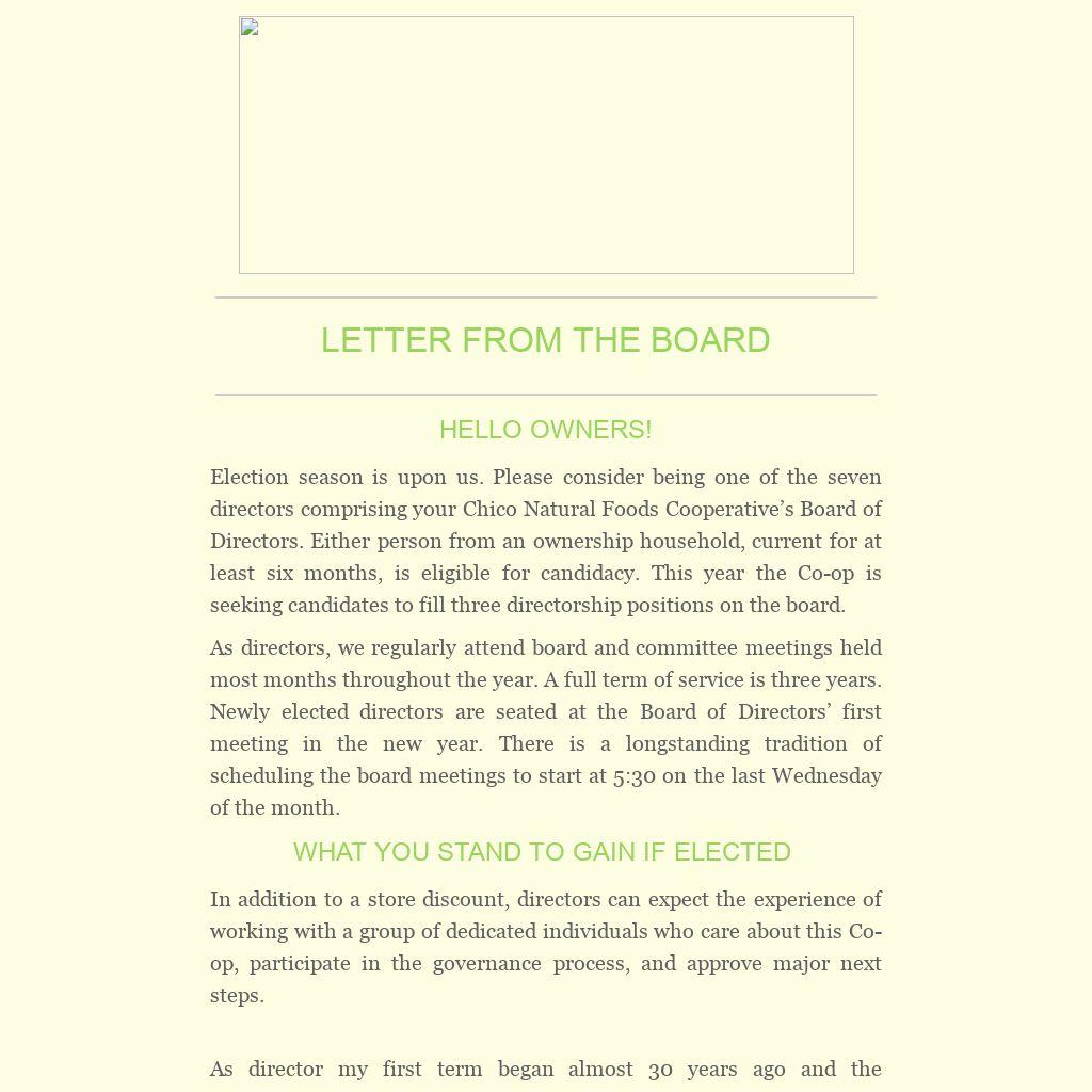 contains five open ended questions. It can be found at the Chico Natural Foods Co-op website by clicking on Board of Directors, and finding the APPLICATION FOR NOMINATION. Your answers will become your candidate statement for the election. If you can volunteer, please take a look at this information and the application questions with openness to the possibility of rewarding yourself and the Co-op with your involvement. DEADLINE FOR APPLICATION: 9.30.16