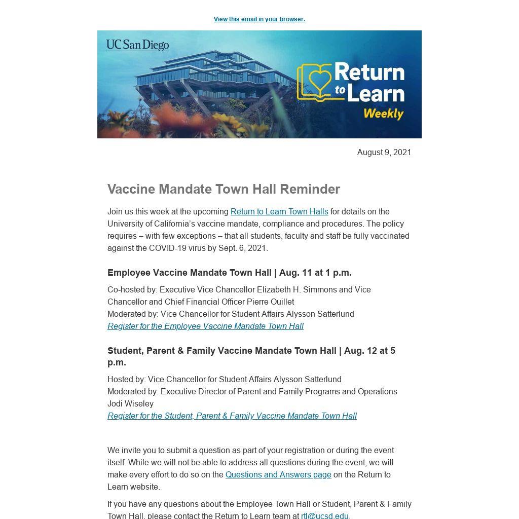 Return to Learn Town Halls for details on the University of California’s vaccine mandate, compliance and procedures. The policy requires – with few exceptions – that all students, faculty and staff be fully vaccinated against the COVID-19 virus by Sept. 6, 2021.