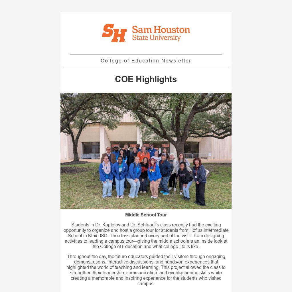 Students in Dr. Koptelov and Dr. Sehlaoui’s class recently had the exciting opportunity to organize and host a group tour for students from Hofius Intermediate School in Klein ISD. The class planned every part of the visit—from designing activities to leading a campus tour—giving the middle schoolers an inside look at the College of Education and what college life is like.