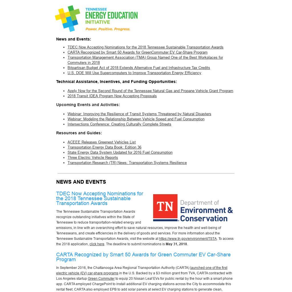| TDEC Now Accepting Nominations for the 2018 Tennessee Sustainable Transportation Awards The Tennessee Sustainable Transportation Awards recognize outstanding initiatives within the State of Tennessee to reduce transportation-related energy and emissions, in line with an overarching effort to save natural resources, improve the health and well-being of Tennesseans, and create efficiencies in the delivery of goods and services. For more information about the Tennessee Sustainable Transportation Awards, visit the website at https://www.tn.gov/environment/TSTA. To access the 2018 application, click here. The deadline to submit nominations is May 31, 2018.