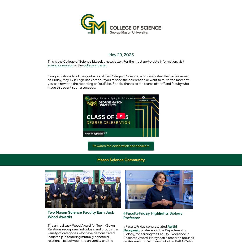 Congratulations to all the graduates of the College of Science, who celebrated their achievement on Friday, May 16 in EagleBank arena. If you missed the celebration or want to relive the moment, you can rewatch the recording on YouTube. Special thanks to the teams of staff and faculty who made this event such a success.