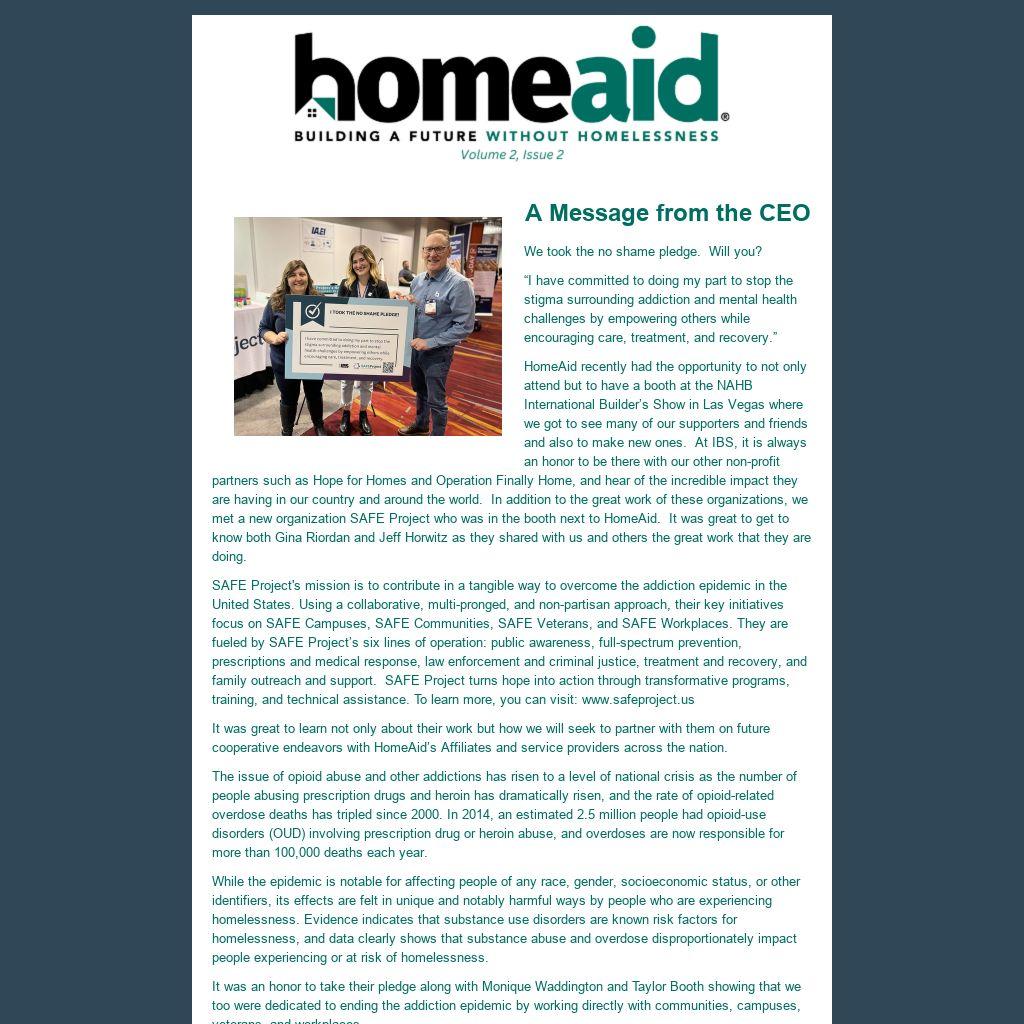 HomeAid recently had the opportunity to not only attend but to have a booth at the NAHB International Builder’s Show in Las Vegas where we got to see many of our supporters and friends and also to make new ones. At IBS, it is always an honor to be there with our other non-profit partners such as Hope for Homes and Operation Finally Home, and hear of the incredible impact they are having in our country and around the world. In addition to the great work of these organizations, we met a new organization SAFE Project who was in the booth next to HomeAid. It was great to get to know both Gina Riordan and Jeff Horwitz as they shared with us and others the great work that they are doing.