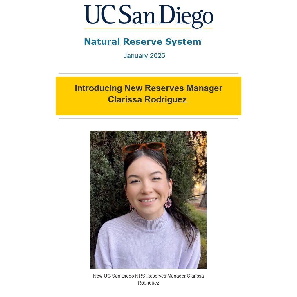 Clarissa Rodriguez joined the UC San Diego Natural Reserve System as Reserves Manager on January 27th. She holds a bachelor’s degree in Environmental Biology from Cal Poly Pomona and a Ph.D. in Plant Biology from UC Riverside, where she studied the impacts of invasive species on California’s native plants. Afterward, Clarissa moved to San Diego for a postdoc at San Diego State University, where she joined the Collaborative of Native Nations for Climate Transformation and Stewardship (CNNCTS) network to advance indigenous-led land stewardship for climate adaptation.