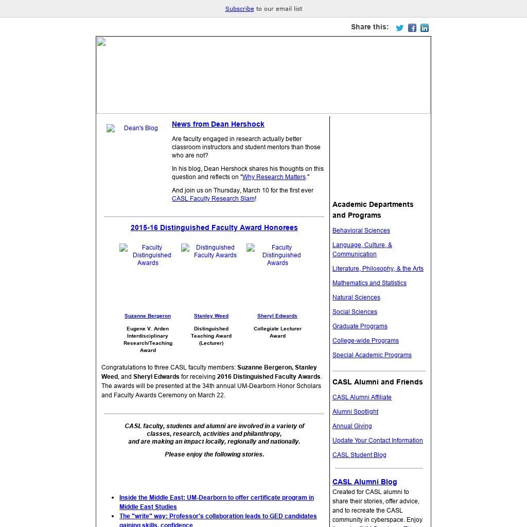 Congratulations to three CASL faculty members: Suzanne Bergeron, Stanley Weed, and Sheryl Edwards for receiving 2016Distinguished Faculty Awards. The awards will be presented at the 34th annual UM-Dearborn Honor Scholars and Faculty Awards Ceremony on March 22.