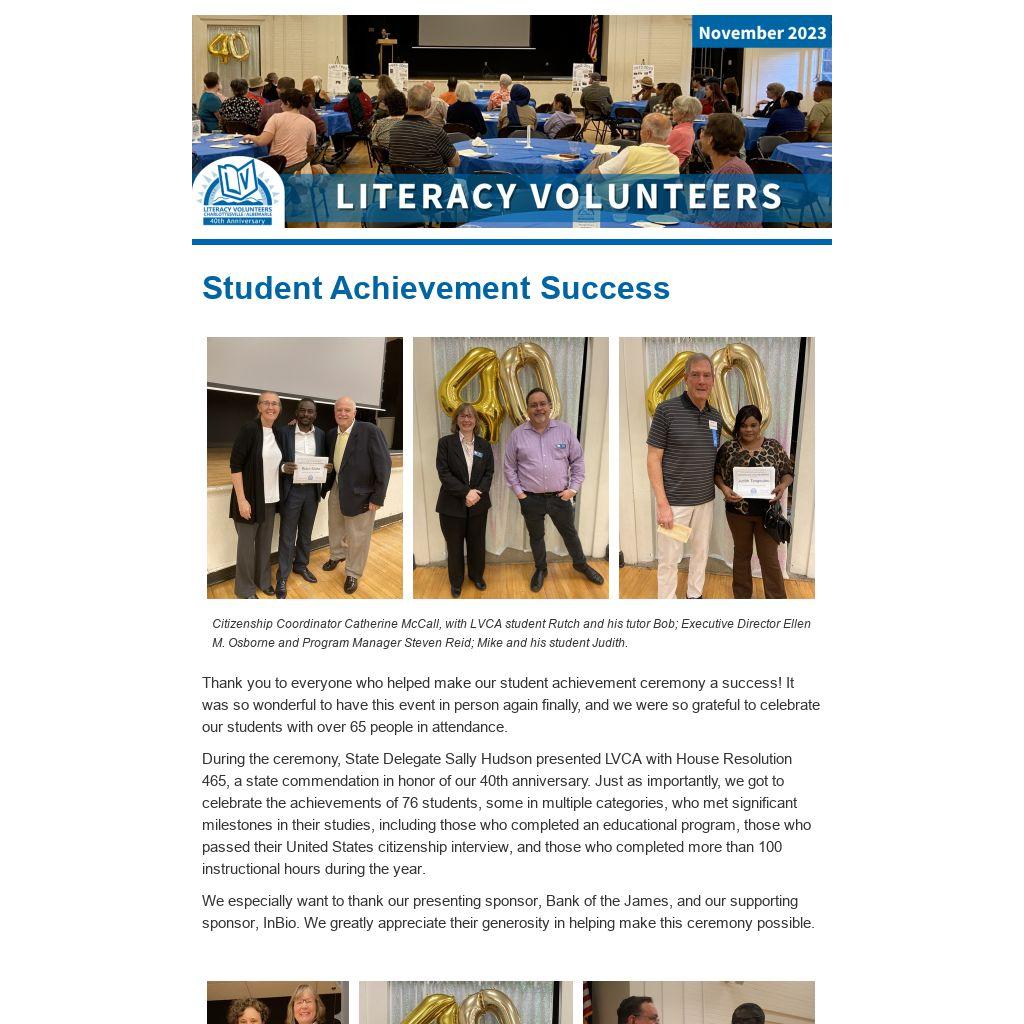 During the ceremony, State Delegate Sally Hudson presented LVCA with House Resolution 465, a state commendation in honor of our 40th anniversary. Just as importantly, we got to celebrate the achievements of 76 students, some in multiple categories, who met significant milestones in their studies, including those who completed an educational program, those who passed their United States citizenship interview, and those who completed more than 100 instructional hours during the year.