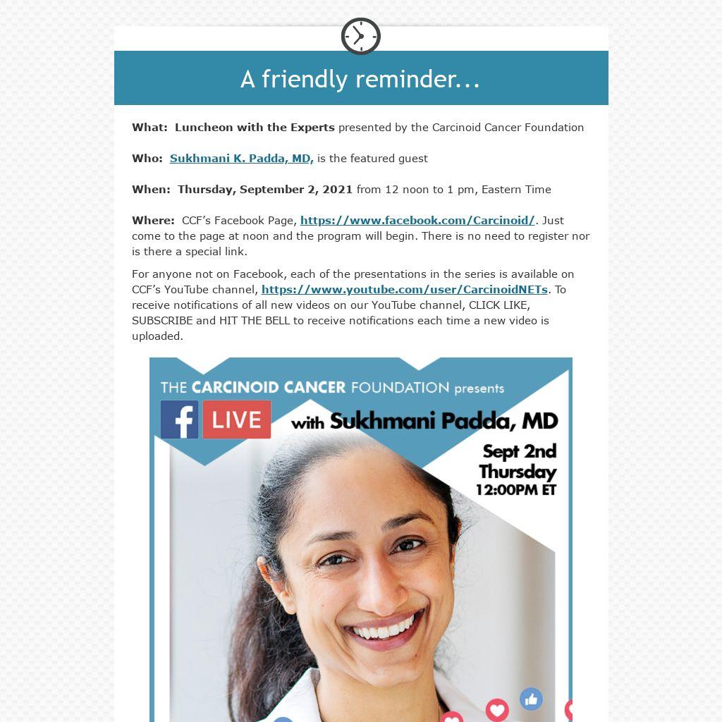 For anyone not on Facebook, each of the presentations in the series is available on CCF’s YouTube channel, https://www.youtube.com/user/CarcinoidNETs. To receive notifications of all new videos on our YouTube channel, CLICK LIKE, SUBSCRIBE and HIT THE BELL to receive notifications each time a new video is uploaded.