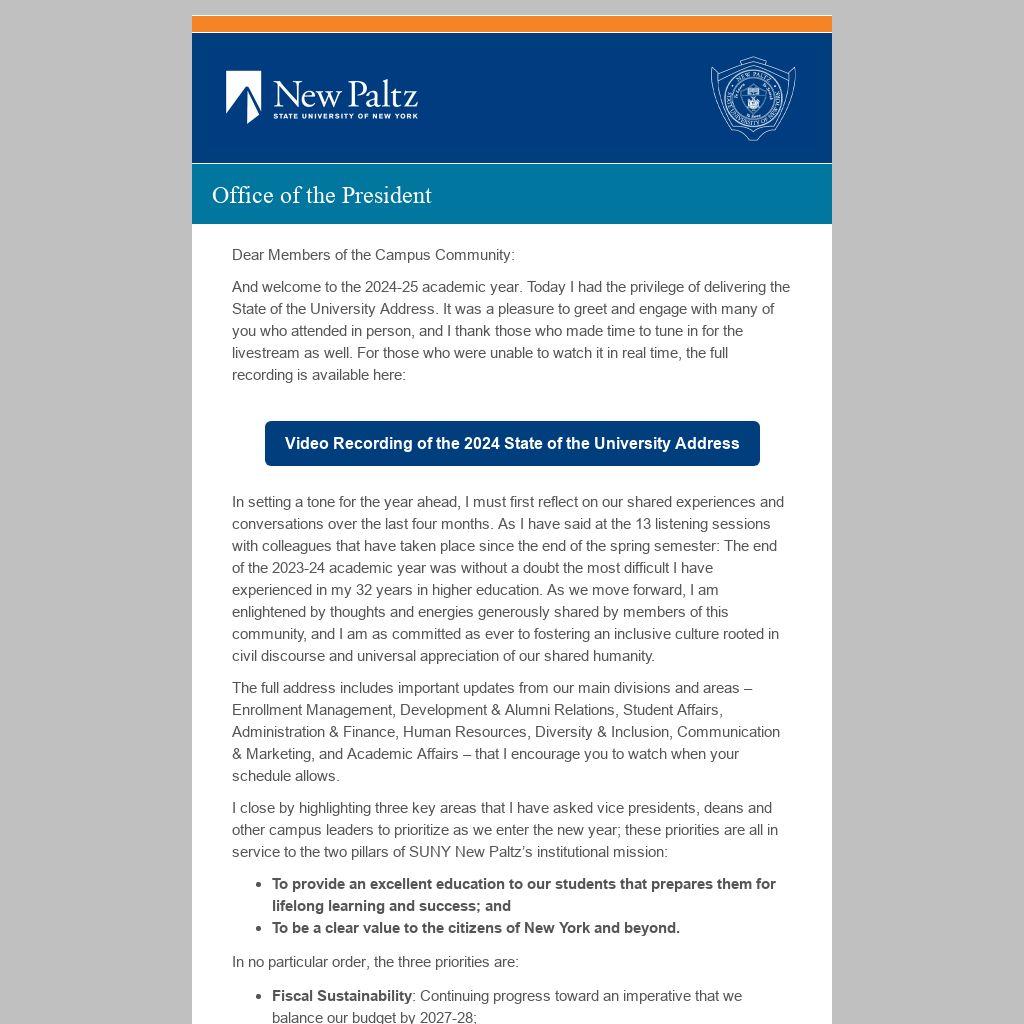 The full address includes important updates from our main divisions and areas – Enrollment Management, Development & Alumni Relations, Student Affairs, Administration & Finance, Human Resources, Diversity & Inclusion, Communication & Marketing, and Academic Affairs – that I encourage you to watch when your schedule allows.