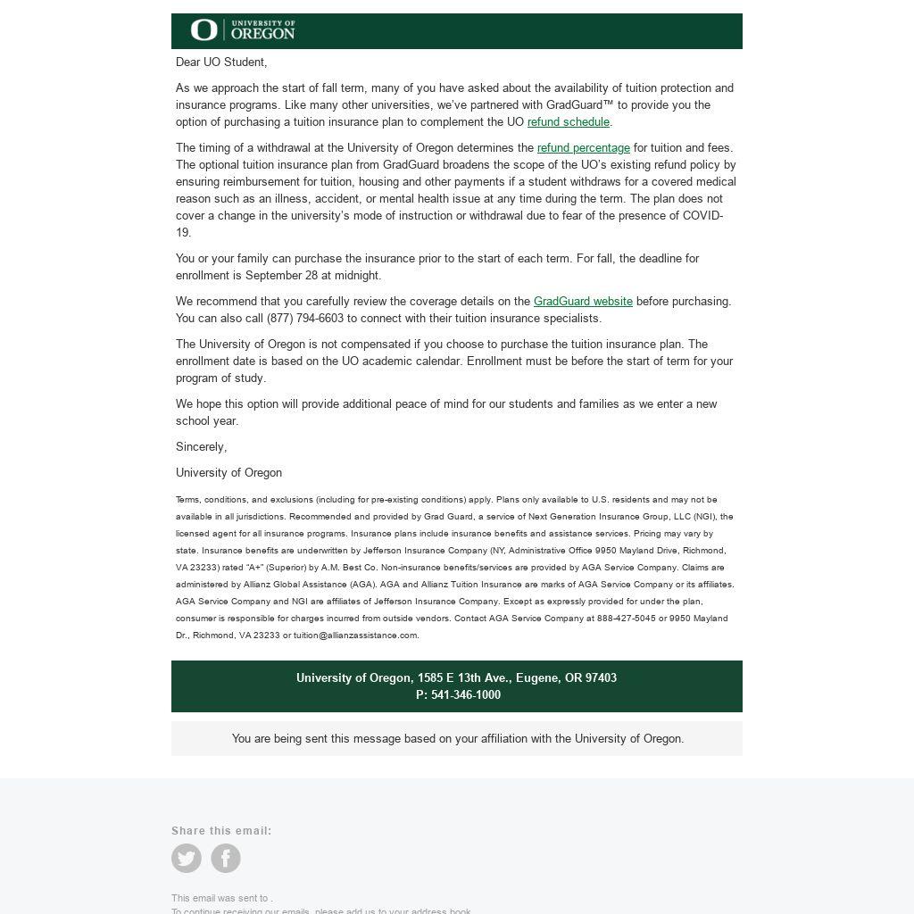 As we approach the start of fall term, many of you have asked about the availability of tuition protection and insurance programs. Like many other universities, we’ve partnered with GradGuard™ to provide you the option of purchasing a tuition insurance plan to complement the UO refund schedule.