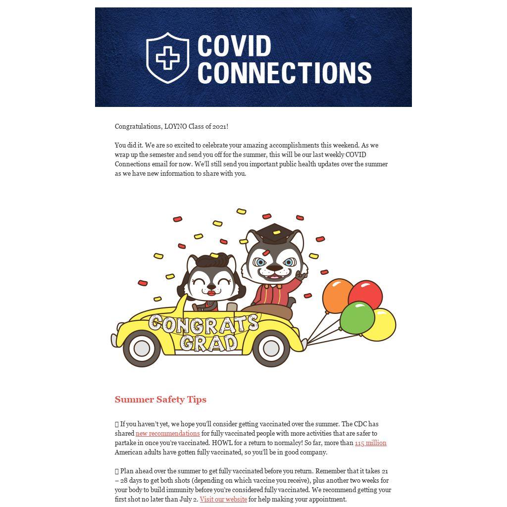 📆 Plan ahead over the summer to get fully vaccinated before you return. Remember that it takes 21 – 28 days to get both shots (depending on which vaccine you receive), plus another two weeks for your body to build immunity before you’re considered fully vaccinated. We recommend getting your first shot no later than July 2.