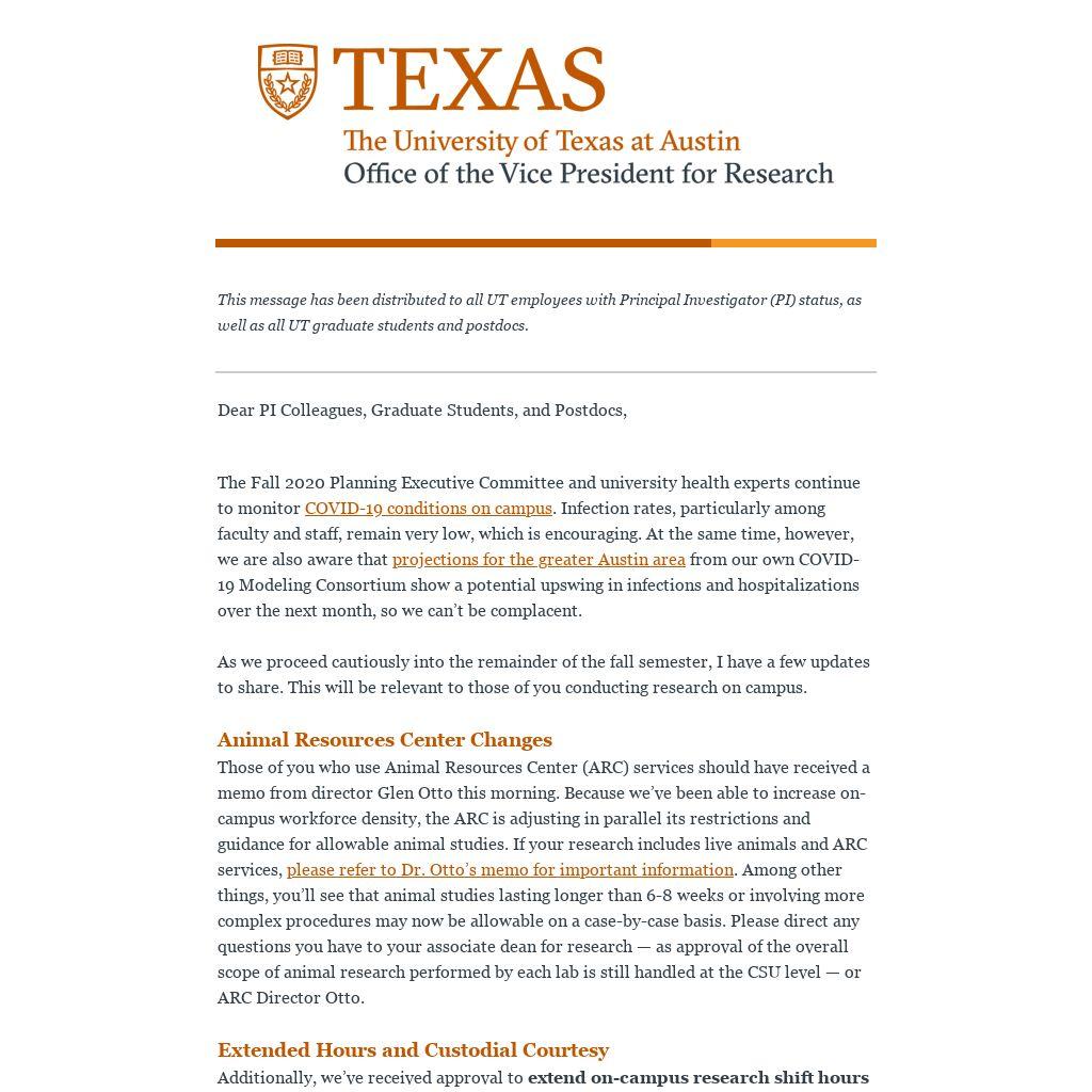 This message has been distributed to all UT employees with Principal Investigator (PI) status, as well as all UT graduate students and postdocs.