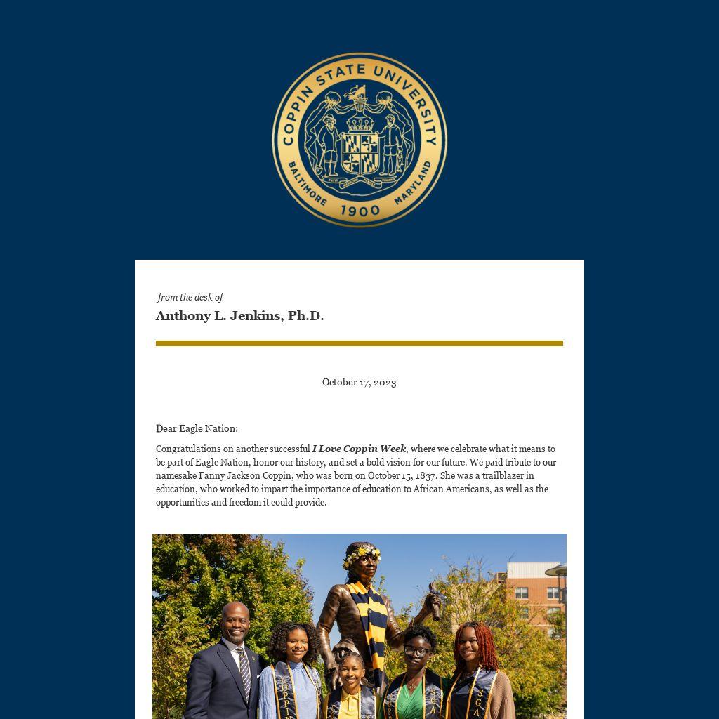Congratulations on another successful I Love Coppin Week, where we celebrate what it means to be part of Eagle Nation, honor our history, and set a bold vision for our future. We paid tribute to our namesake Fanny Jackson Coppin, who was born on October 15, 1837. She was a trailblazer in education, who worked to impart the importance of education to African Americans, as well as the opportunities and freedom it could provide.