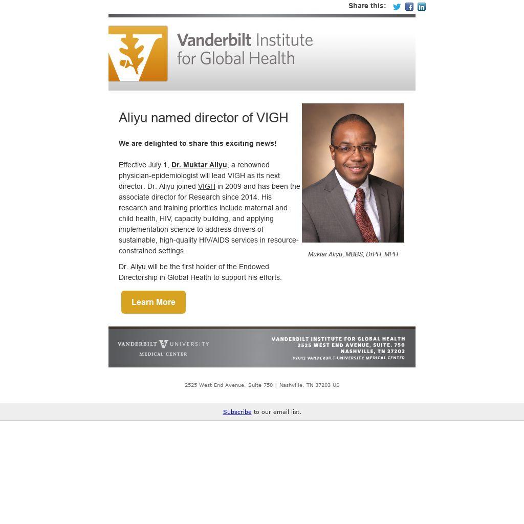 Effective July 1, Dr. Muktar Aliyu, a renowned physician-epidemiologist will lead VIGH as its next director. Dr. Aliyu joined VIGH in 2009 and has been the associate director for Research since 2014. His research and training priorities include maternal and child health, HIV, capacity building, and applying implementation science to address drivers of sustainable, high-quality HIV/AIDS services in resource-constrained settings.