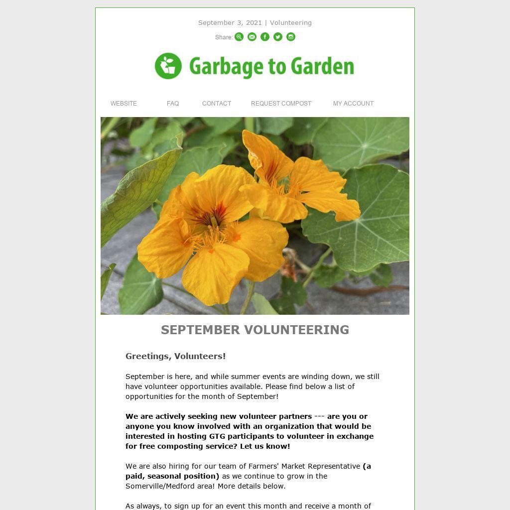 As always, to sign up for an event this month and receive a month of free Garbage to Garden service, RSVP by email, and we will help answer any questions you may have. Remember, events are first-come, first-serve.