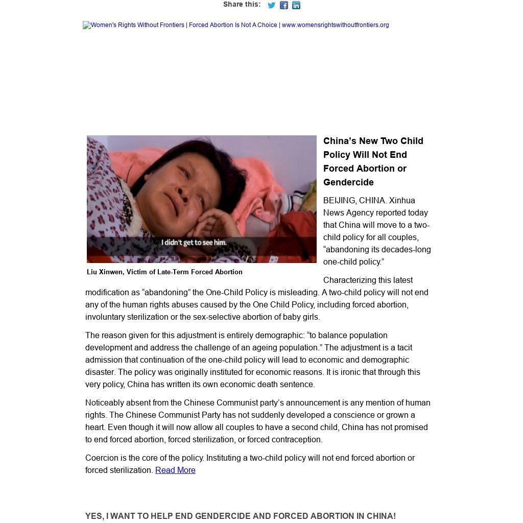 China’s New Two Child Policy Will Not End Forced Abortion or Gendercide