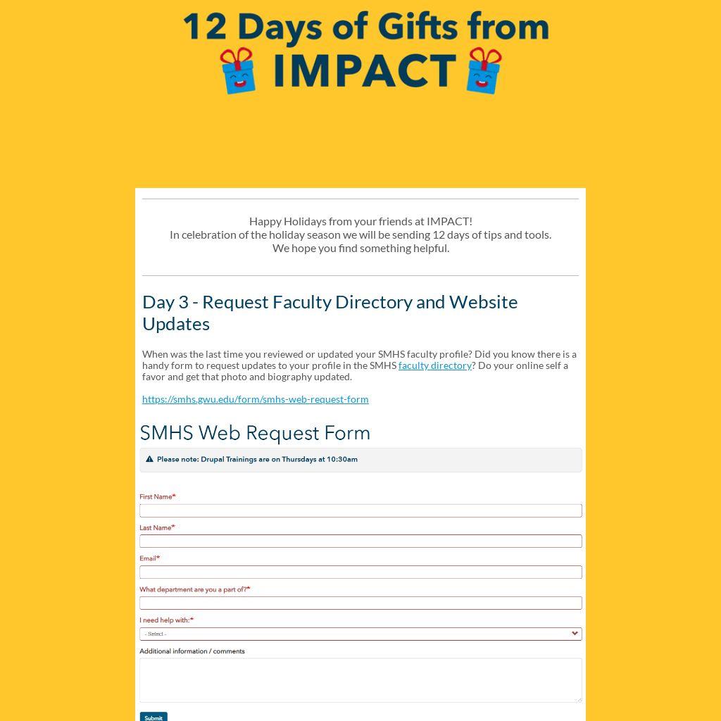 When was the last time you reviewed or updated your SMHS faculty profile? Did you know there is a handy form to request updates to your profile in the SMHS faculty directory? Do your online self a favor and get that photo and biography updated.