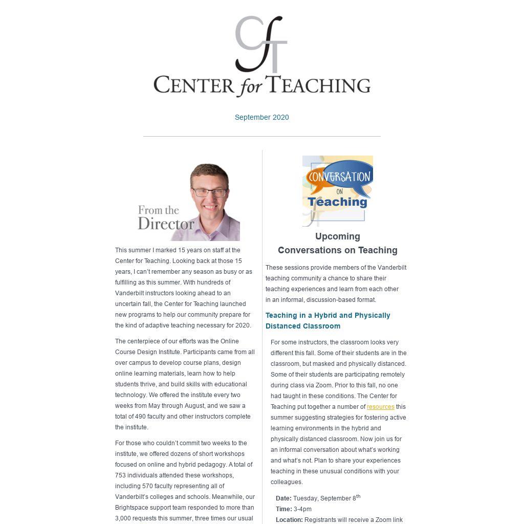 | This summer I marked 15 years on staff at the Center for Teaching. Looking back at those 15 years, I can’t remember any season as busy or as fulfilling as this summer. With hundreds of Vanderbilt instructors looking ahead to an uncertain fall, the Center for Teaching launched new programs to help our community prepare for the kind of adaptive teaching necessary for 2020.