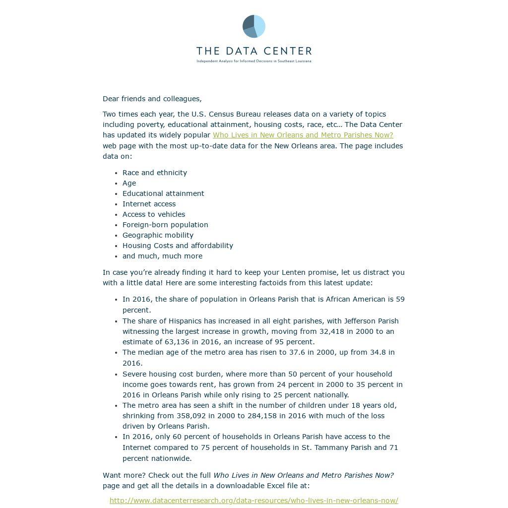 Two times each year, the U.S. Census Bureau releases data on a variety of topics including poverty, educational attainment, housing costs, race, etc… The Data Center has updated its widely popular Who Lives in New Orleans and Metro Parishes Now? web page with the most up-to-date data for the New Orleans area. The page includes data on: